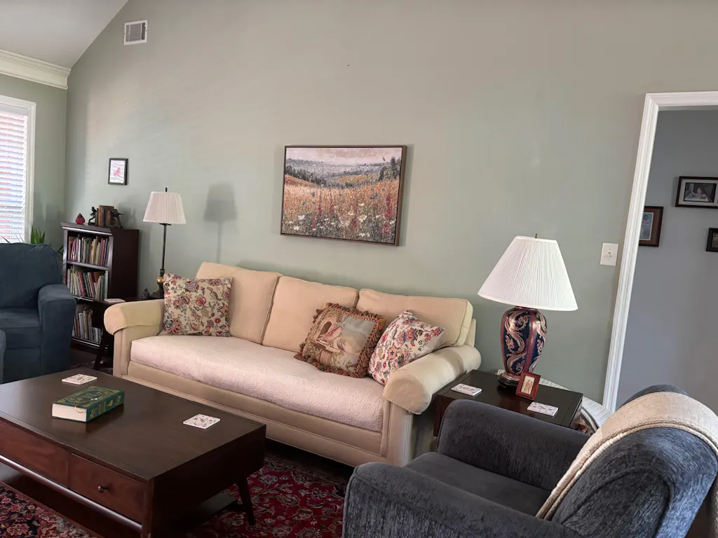 The wildflower painting perfectly completes the living room decor. The colors complement furniture and rug. The painting was delivered as promised and was carefully packaged. This 81 year old grandmother easily unwrapped and hung it. I could not be more pleased!