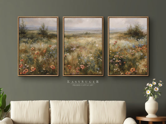 EasySuger 3 Panels Wildflowers field Landscape Wall Art, Vintage Nature Framed Large Gallery Art, Antique Art Ready to Hang | 3VG