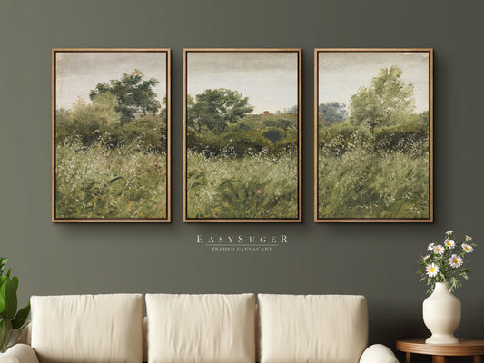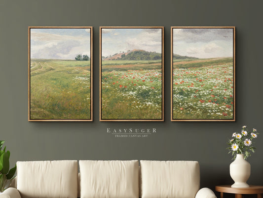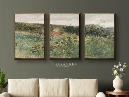 3 Panels Wildflowers field Landscape Wall Art, Vintage Nature Framed Large Gallery Art, Antique Art Ready to Hang