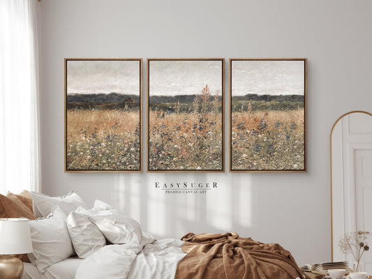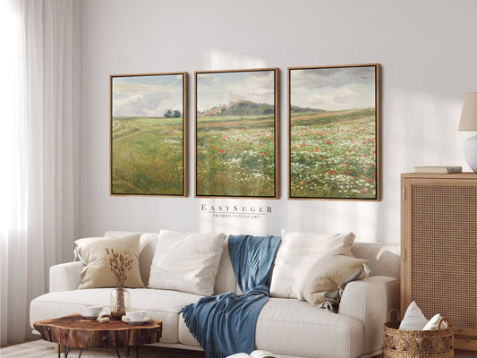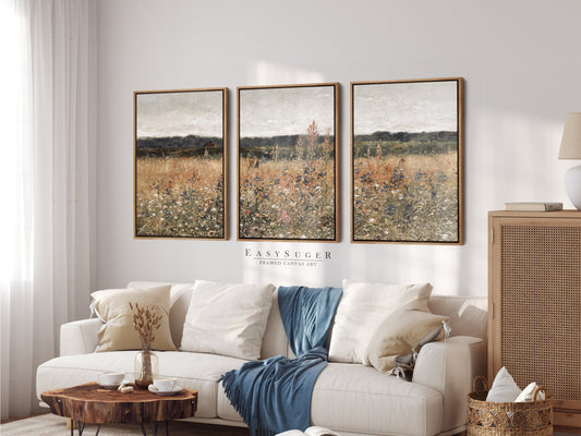 EasySuger 3 Panels Wildflowers field Landscape Wall Art, Vintage Nature Framed Large Gallery Art, Antique Art Ready to Hang | 3GH