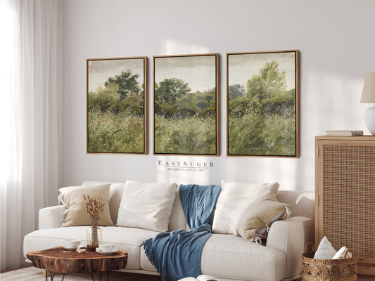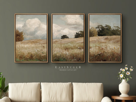 EasySuger 3 Panels Wildfield Landscape Wall Art, Vintage Nature Framed Large Gallery Art, Antique Art Ready to Hang