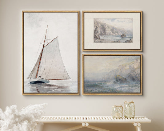 EasySuger Set of 3 Vintage Seascape Wall Art, Ocean and Boat Wall Art, Framed Canvas Wall Art for Living room and Bedroom, Natural Wall Art